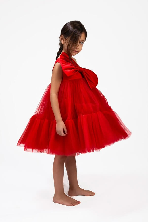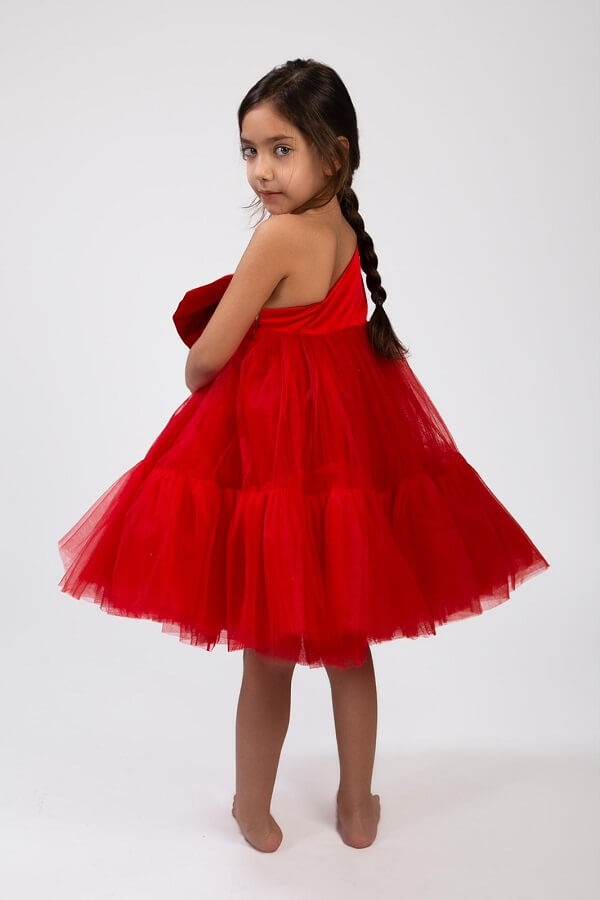 دامن توری و چند لایه قرمز و آستر راحتی دارد و یک پاپیون قرمز بزرگ هم برروی لباس نصب شده است. زیپ این لباس نیز از کنار بسته میشود.